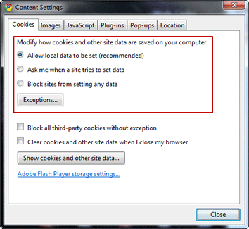 - Click the "Exceptions" button to enter specific websites that you wish to allow/disallow to set cookies