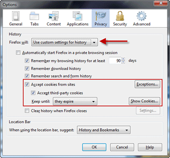 - Under the "Firefox will:" dropdown, select "Use custom settings for history"